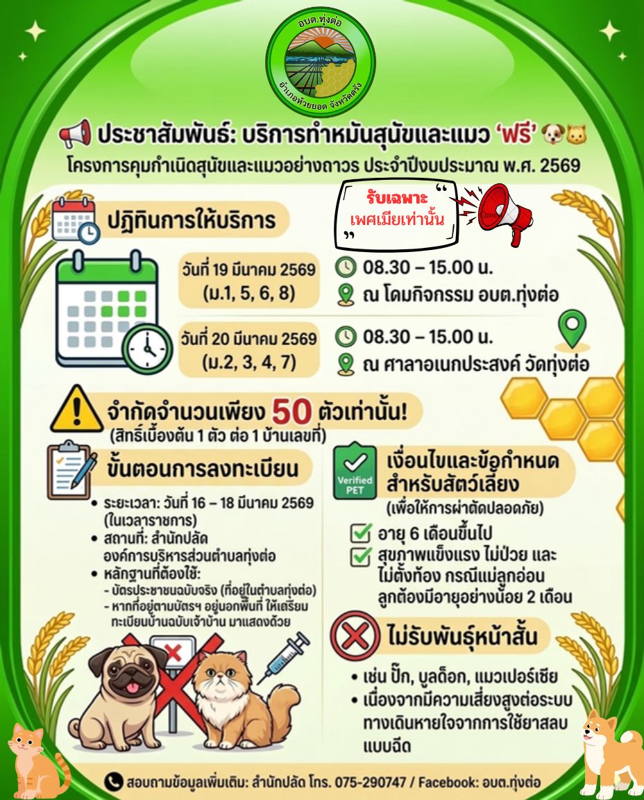 โครงการคุมกำเนิดสุนัขและแมวอย่างถาวร ประจำปีงบประมาณ พ.ศ. 2569 |